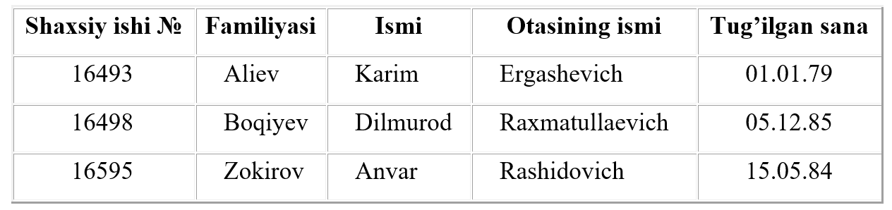 Misol sifatida talabalar xaqidagi ma‘lumotlarni saqlovchi ma‘lumotlar bazasining bir qismini keltiramiz.