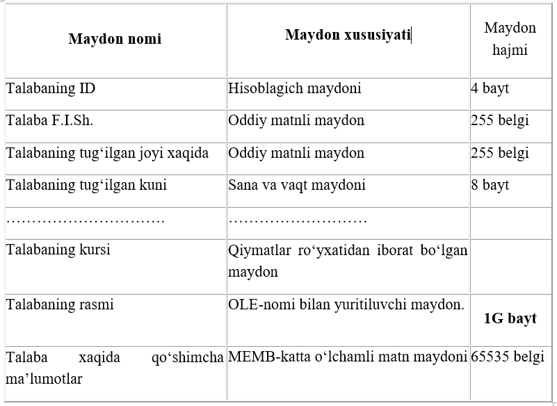 8. OLE-nomi bilan yurituvchi maydon. Bu maydon Excel jadvalini, Word xujjatini, rasm, ovoz va boshqa shu kabi ma‘lumotlarni ikkilik sanoq sistemasida saqlaydi. Maydon o‘lchami 1Gbaytgacha.